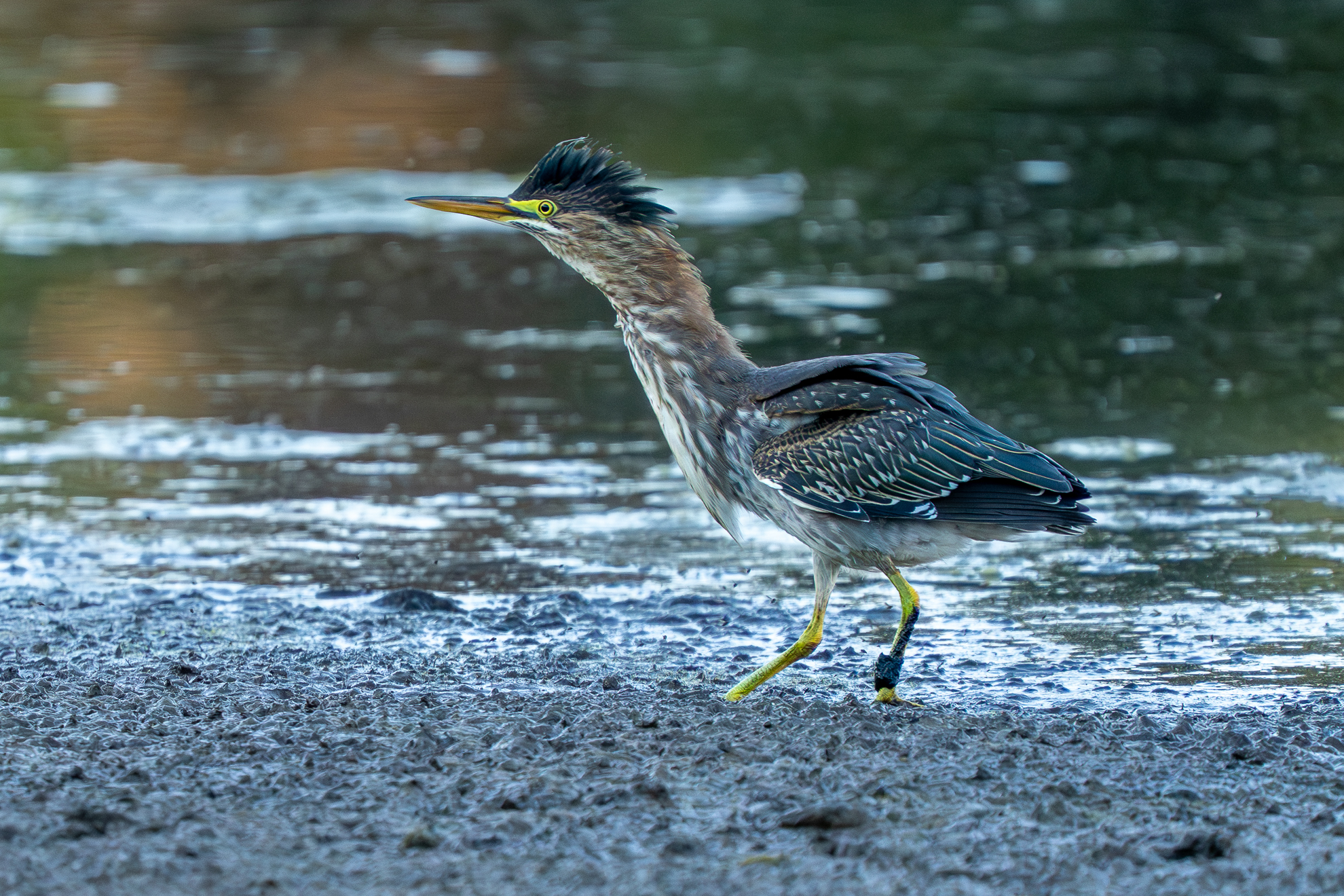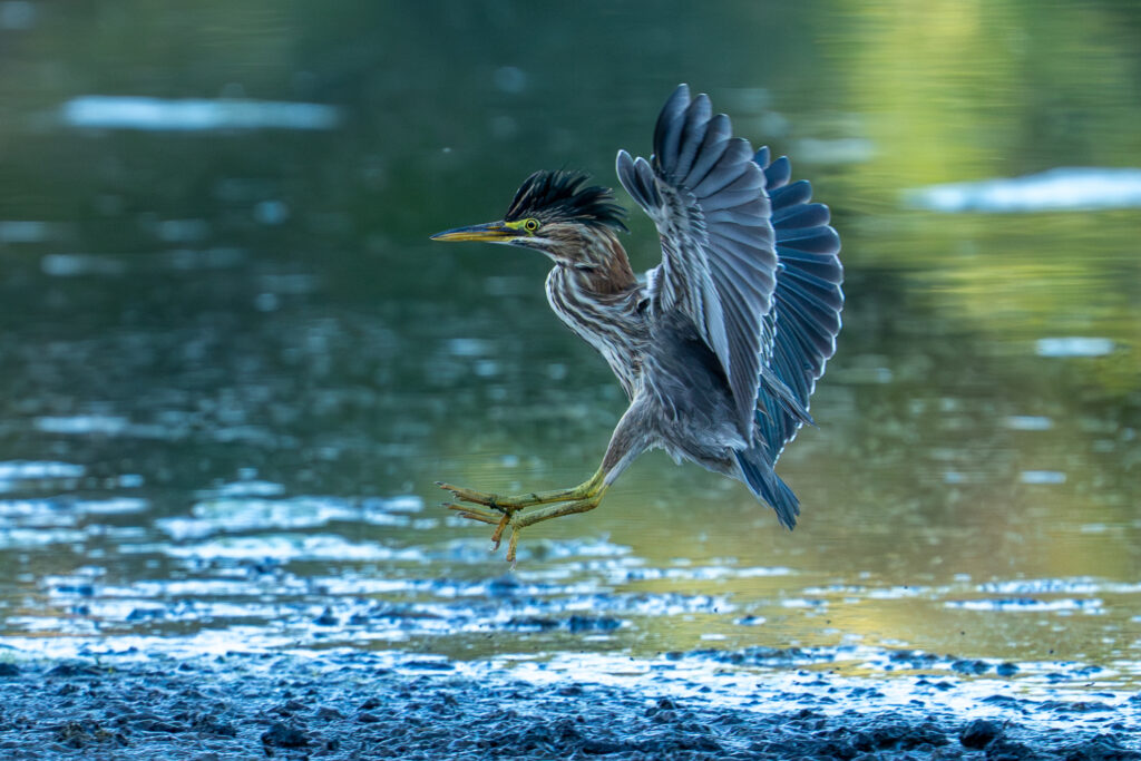 This morning, though, because I got there so early, I was able to linger in a few of the nicer spots, and at one of them, I caught the arrival of a Green Heron on the beach. The scene is still in shadow because the sun is behind the trees behind me, but today’s cameras capture so much information that it’s almost trivial to get usable images out of them: