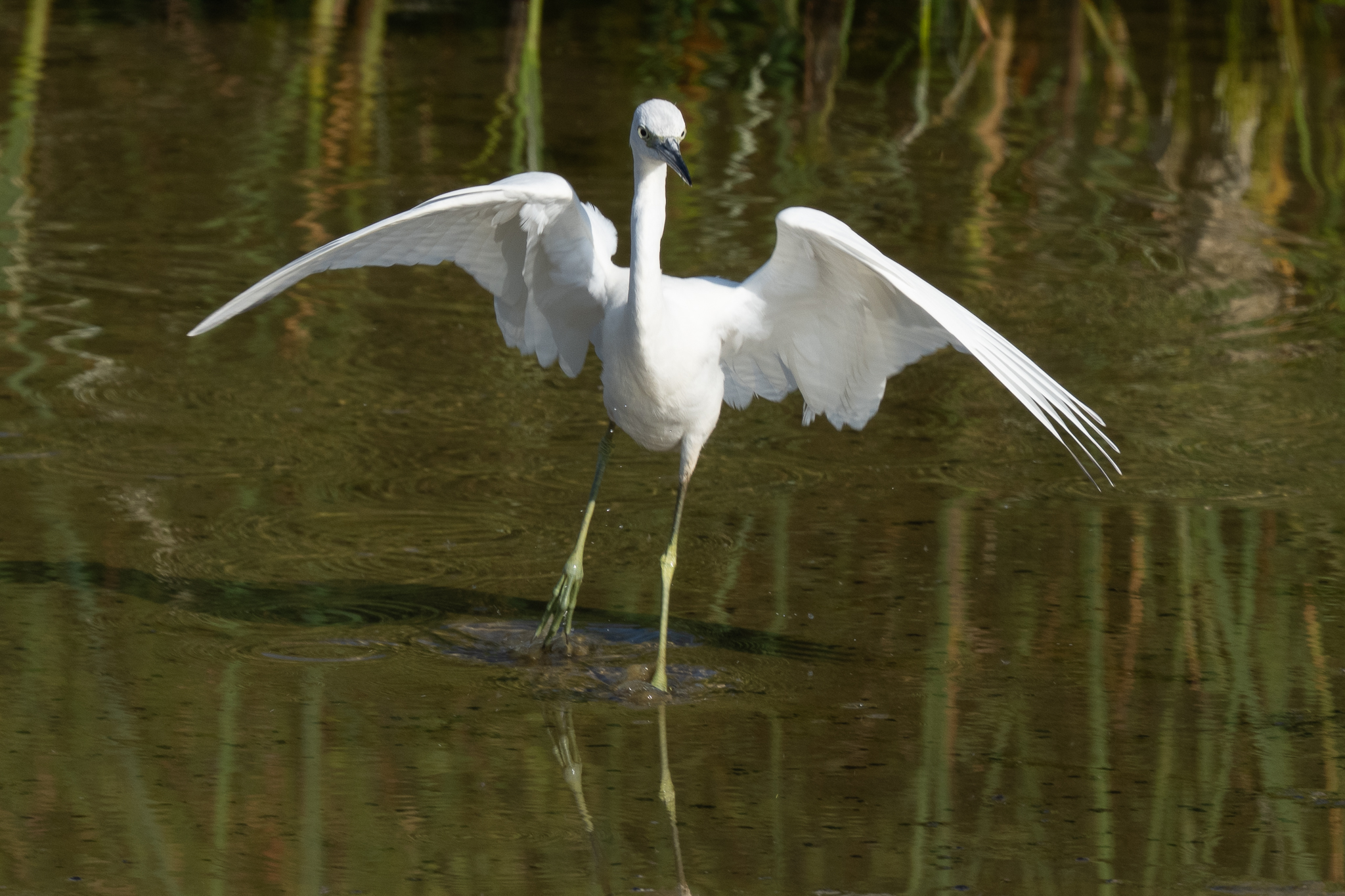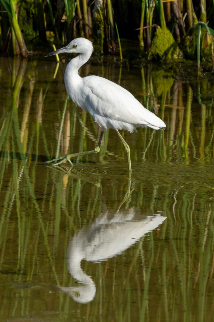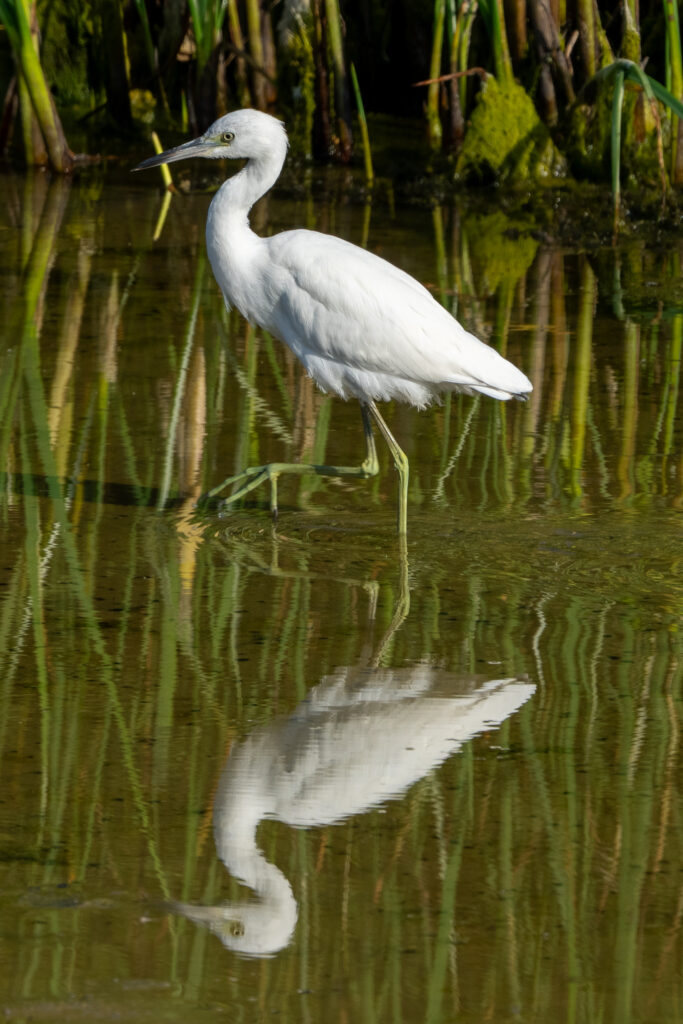And sure enough, closer looks at the bird revealed its green legs, a large-looking eye with a pale iris, and even (clinching the ID when visible) dark on the wingtips. Sure enough, a Little Blue Heron. Look at every bird until you see what it is. Don’t look at them and know what it is.