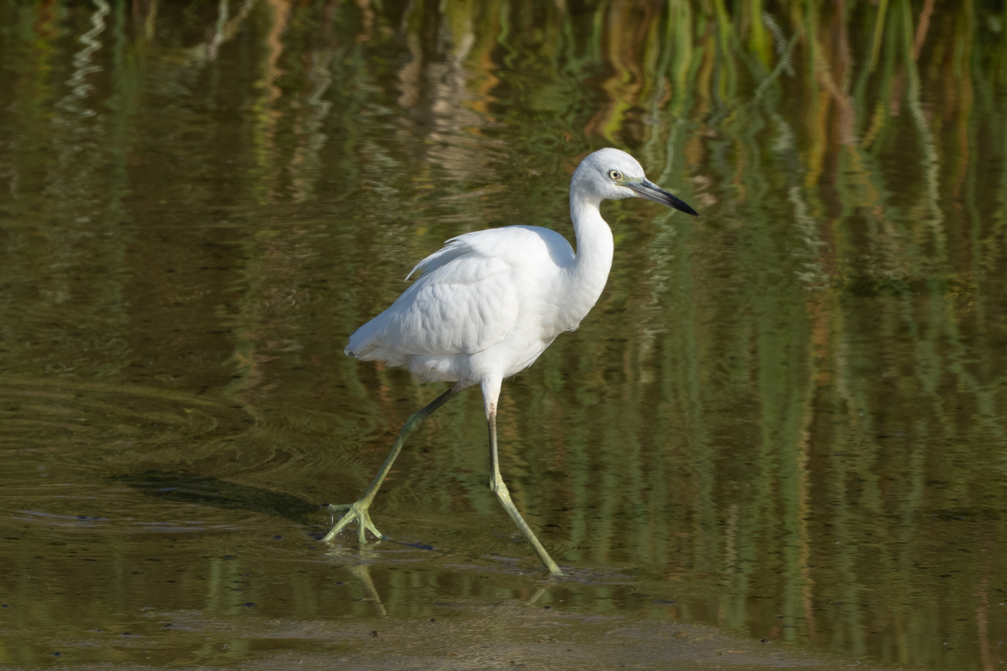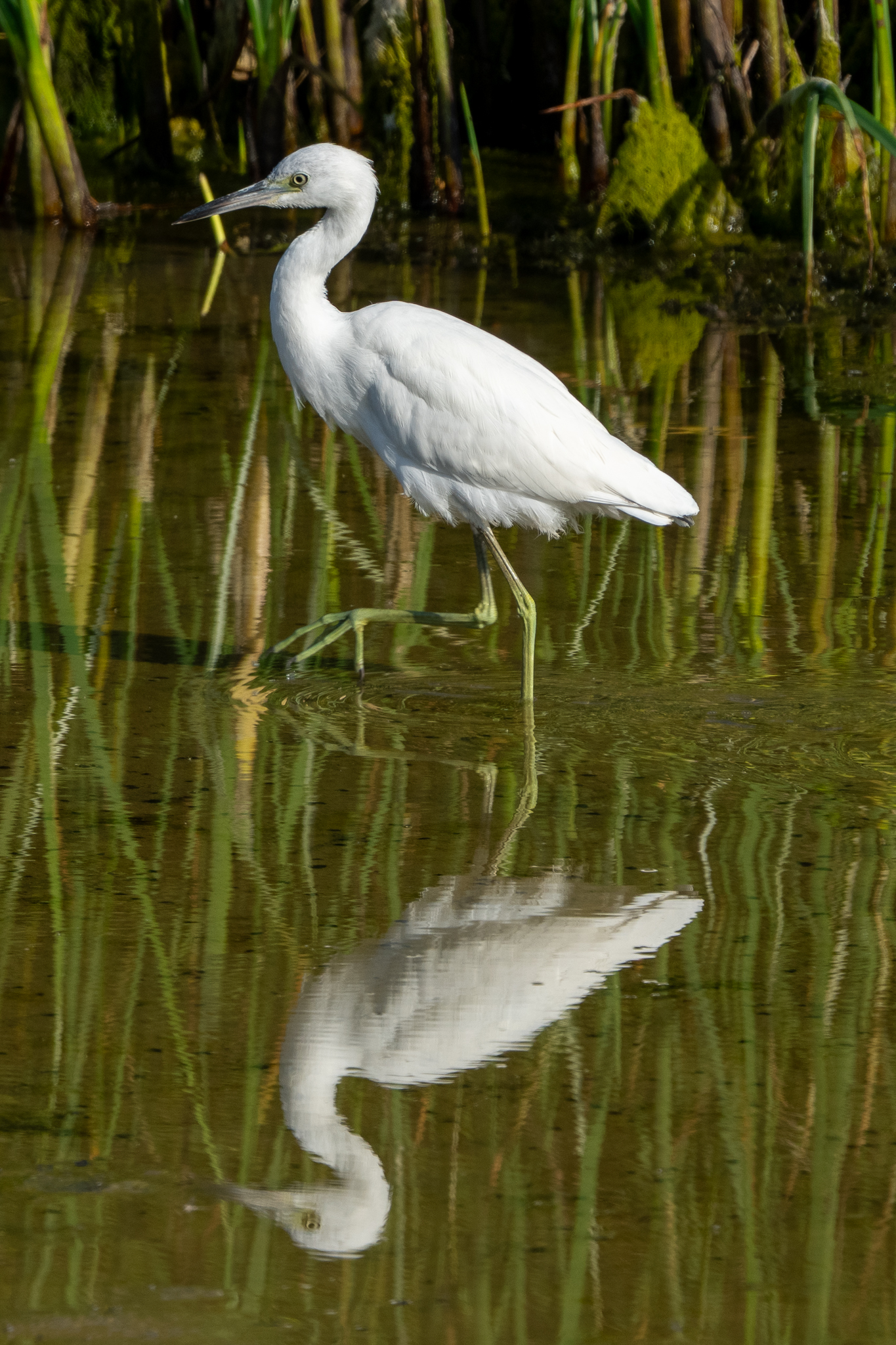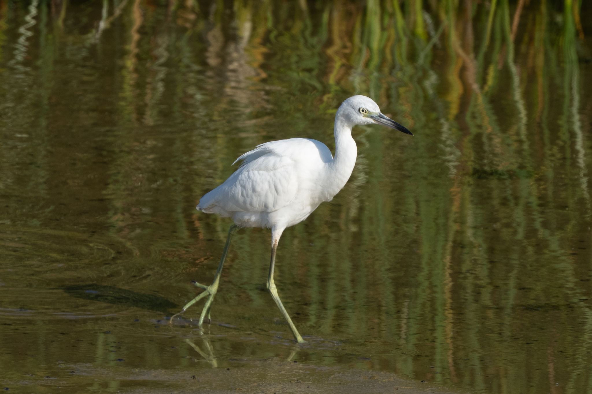 Among the group were several of our county’s best birders, and then me. We all walked up the creek together, and one of the young hotshots immediately started stirring up trouble: “That white bird looks like a Little Blue Heron.” “Ha,” I thought to myself, “I used to reach for rare birds when I was starting out, too. Young Snowy Egrets look a bit different from adult birds, but a Little Blue? I doubt it.” Then again, Liam is one of our county’s most talented birders; if he’s mentioning something, odds are there’s something worth mentioning.