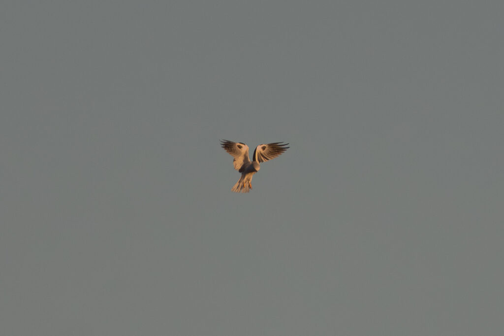 This morning the views were more distant but still amazing. It began with a distant view of a White-tailed Kite hovering (they rarely, perhaps never, actually “kite,” soaring from one location to the next and hovering without flapping) above a field. (In fact, there were two kites, but only one came close enough for any kind of aerial view.)