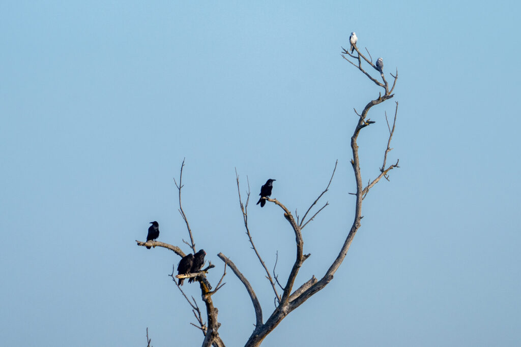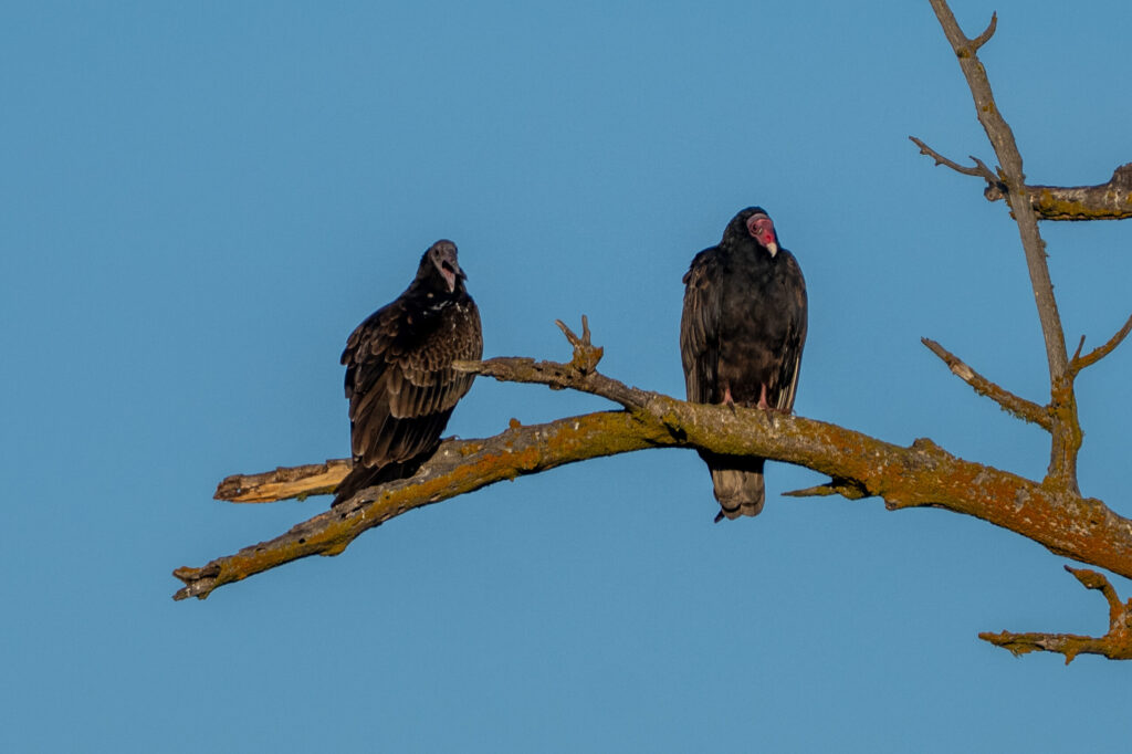 I first saw the birds on a distant snag, the remains of a very large tree. They were sharing the perch with a pair of Common Ravens, and an adult and juvenile Turkey Vulture (from this vantage, you can’t tell the difference very well, but a closer look from the other side of the tree shows it well; see second image).