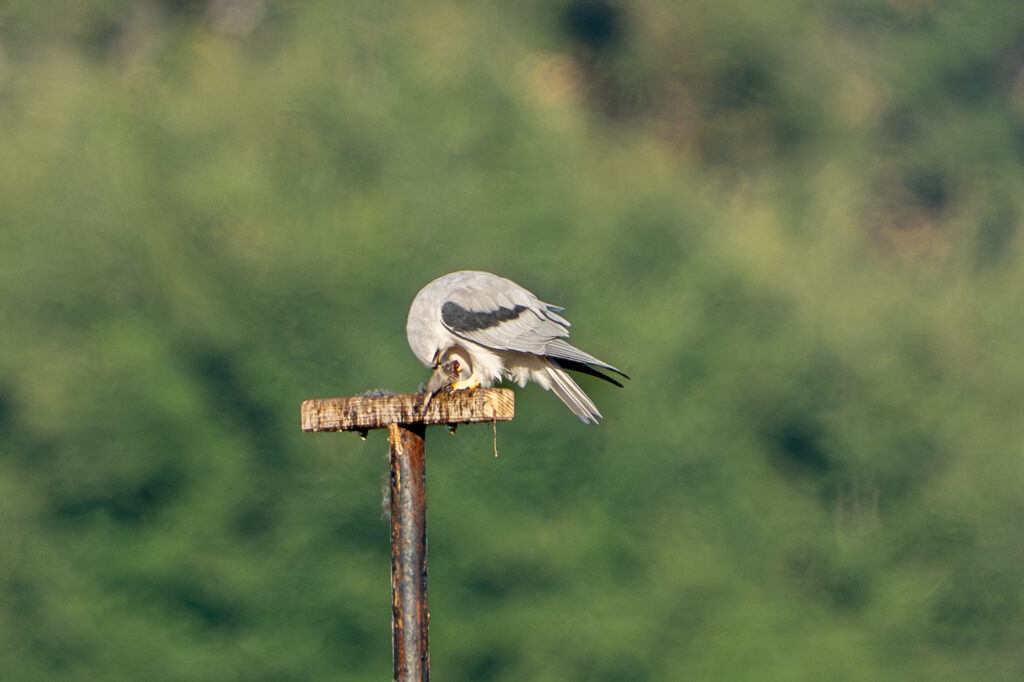 As I continued on the path, one of the kites took off and, way, way off in the distance, floated down to the ground behind a stand of trees. And the next time I saw it, it was on the perch digging into some kind of varmint that it was having for breakfast. (See first gallery)