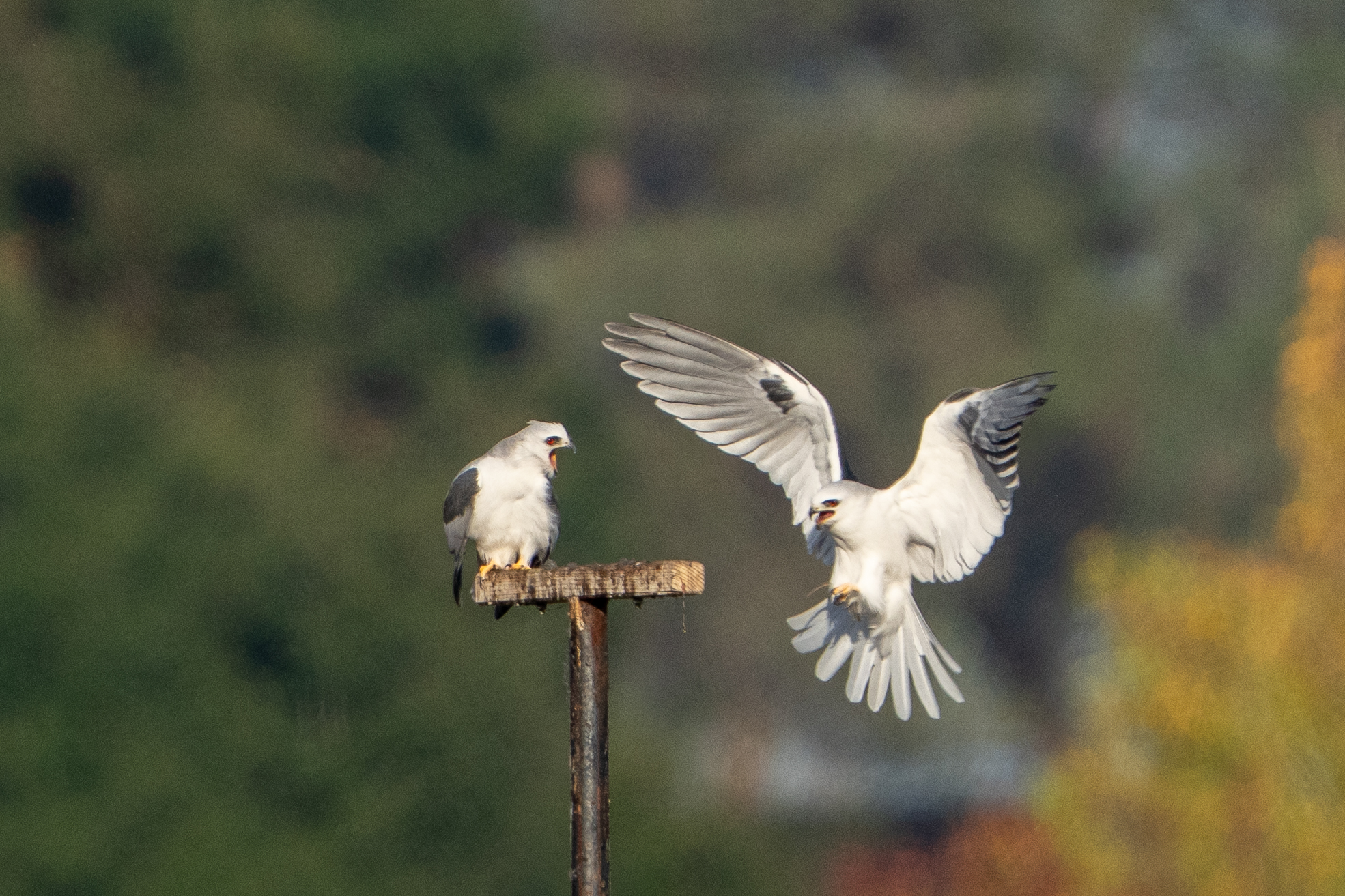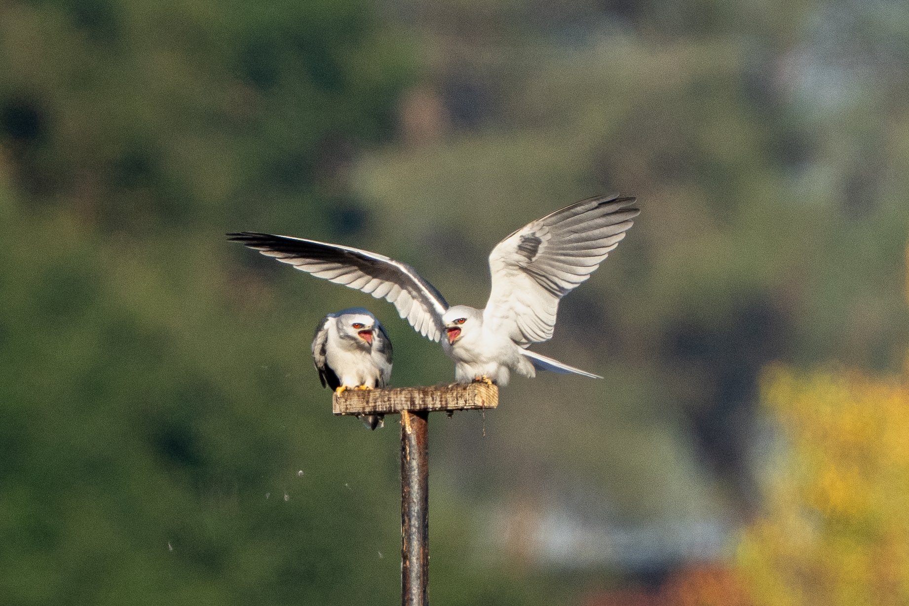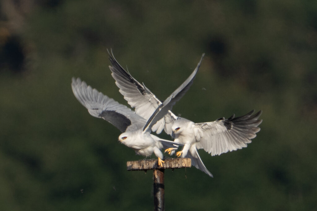 A couple of weeks ago on my long walk through my neighborhood, I saw a pair of White-tailed Kites on a perch. I see this pair almost every time I go there, and I believe that they are an adult pair that has raised a brood there before (this July, I saw a whole family of kites there.) The perch isn’t very close to the path, which is great for the birds, less great for the photographers. (I’m considering ponying up for a teleconverter so I can get my camera a bit closer without disturbing the birds by actually moving closer.) But it’s in the middle of a beautiful open hillside and seasonal wetland, with a great downed tree providing perches and cover for harriers and red-tailed hawks, and the height of the grasses combined with the acreage makes it a rich hunting ground for other aerial predators like the kites, and even a coyote or three.