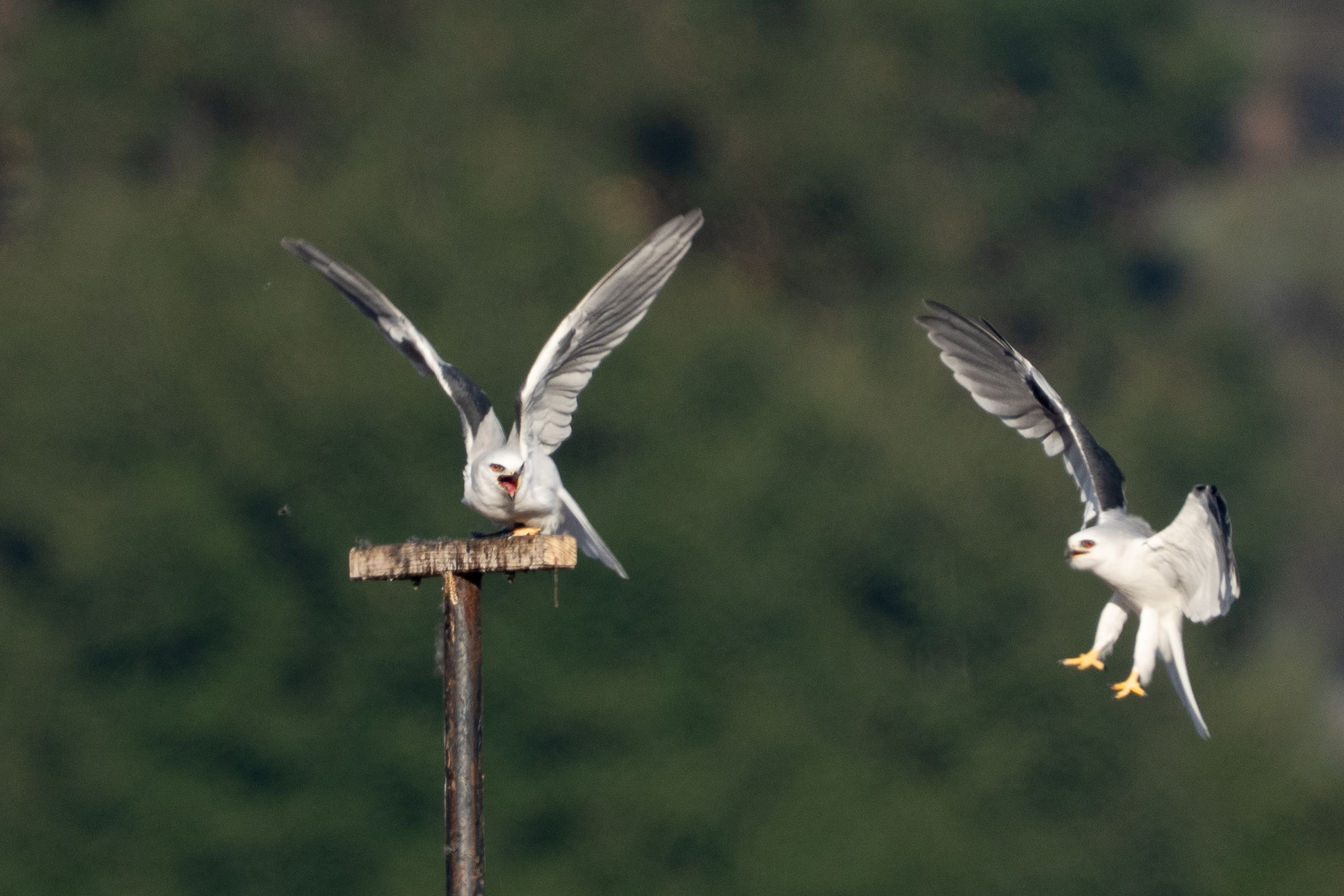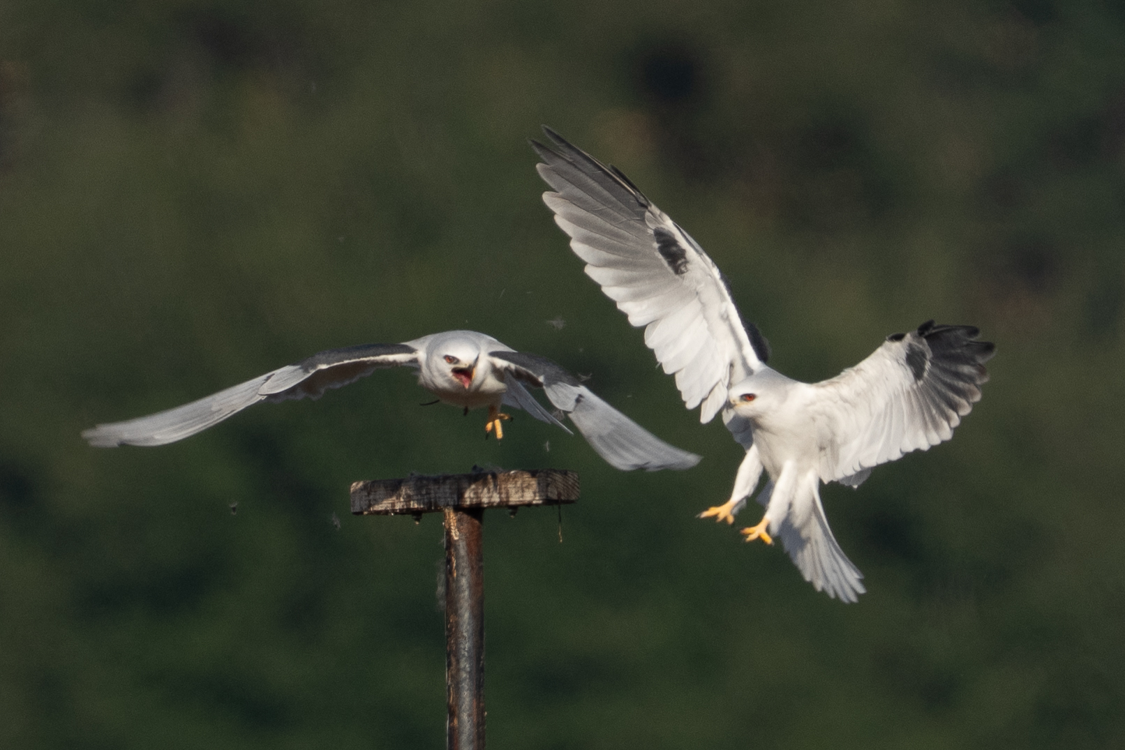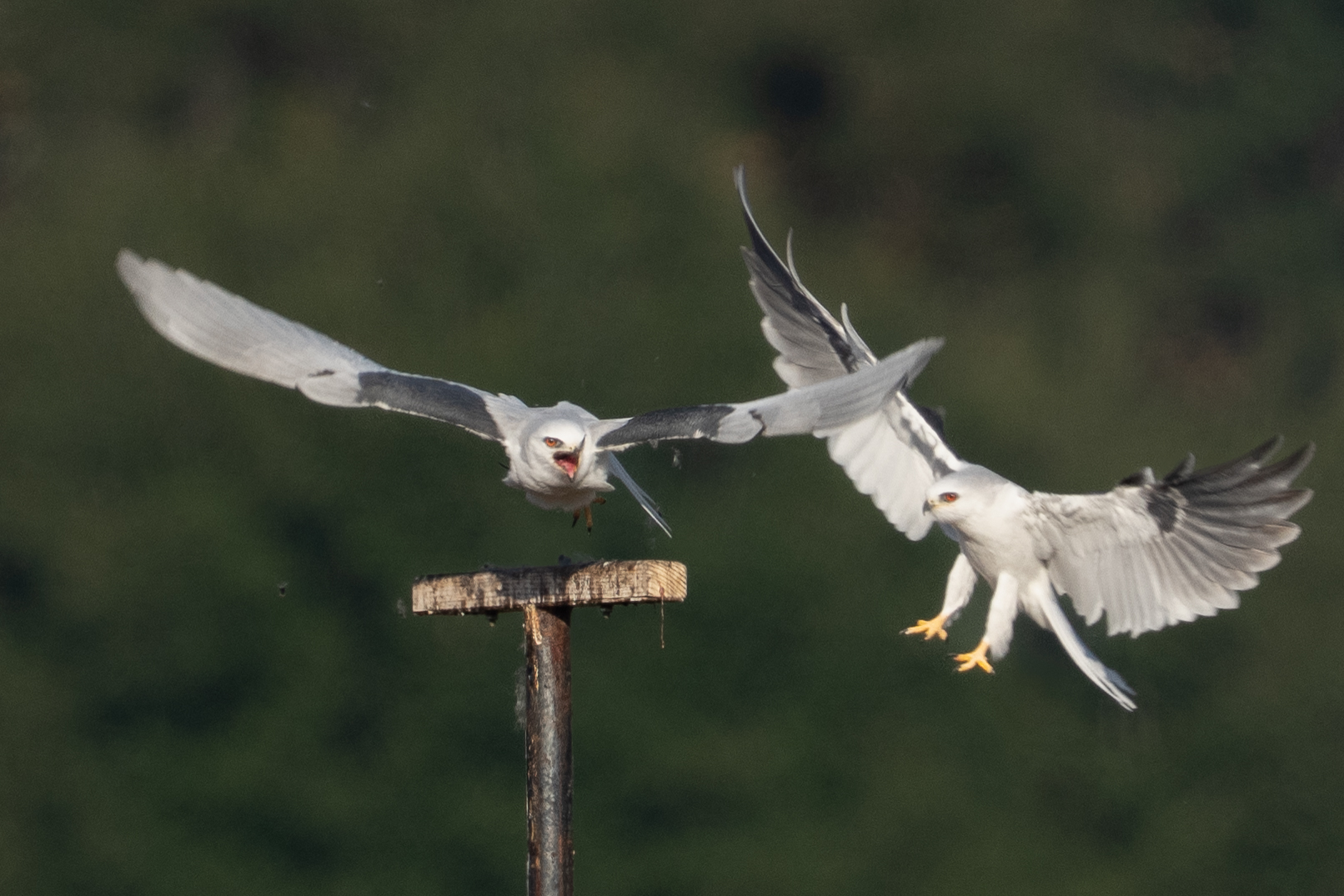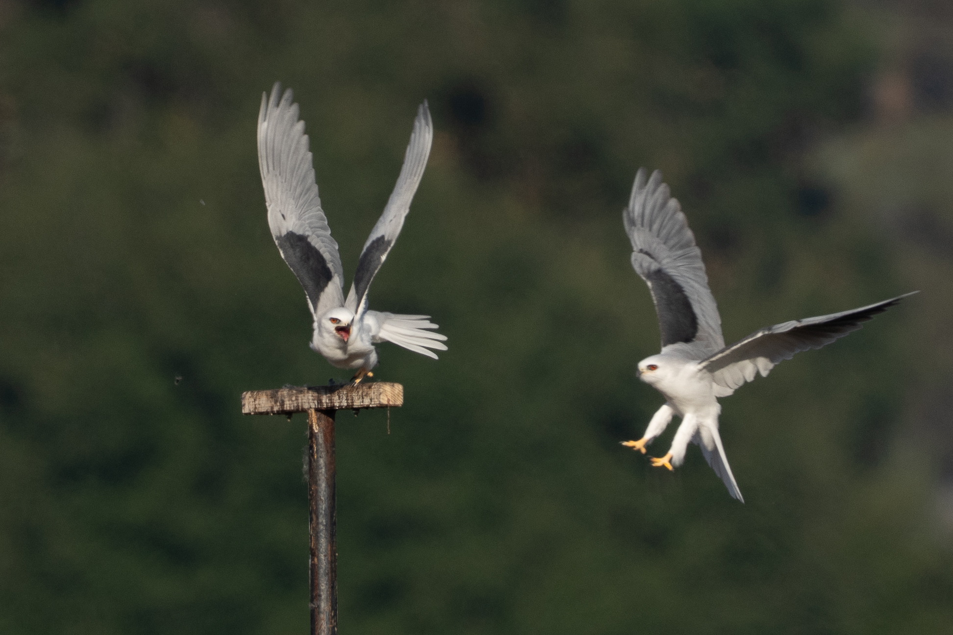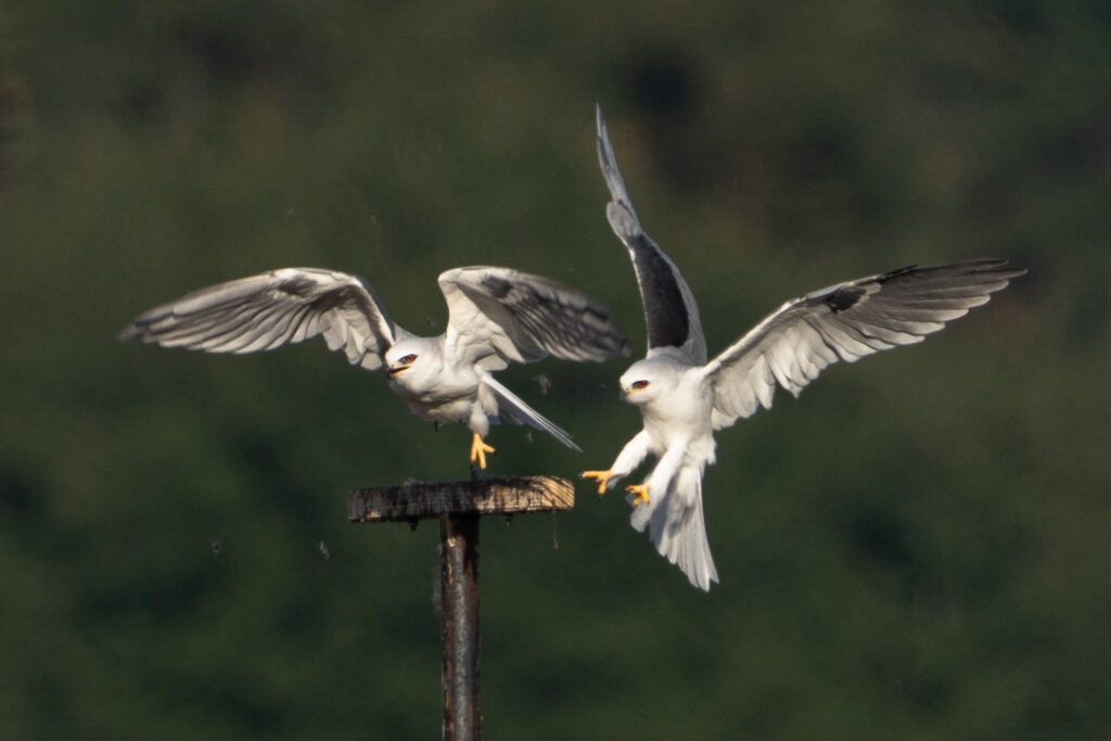 As I got to the closest approach for my camera, the bird heard the second kite, its mate(?) calling. I don’t know why, but it looked right at me and started calling back. Then, on the approach of Kite 2, it left the perch. Perhaps Kite 2 is a known clumsy lander, perhaps Kite 1 just didn’t want to share the meal, I don’t know.