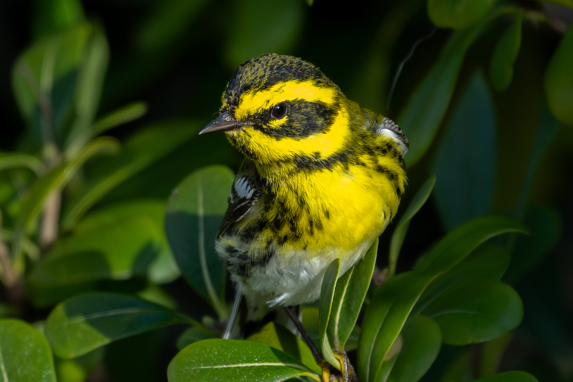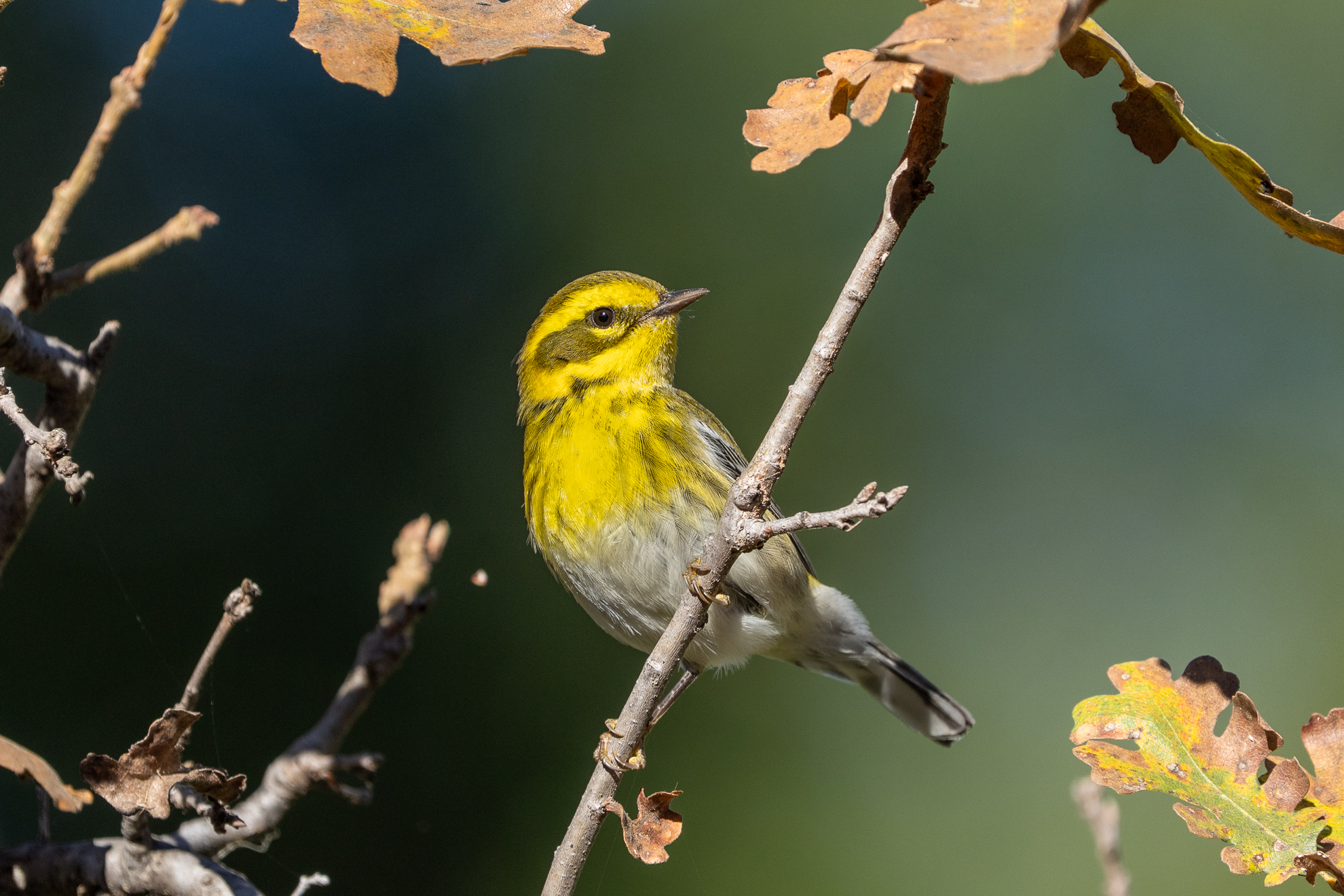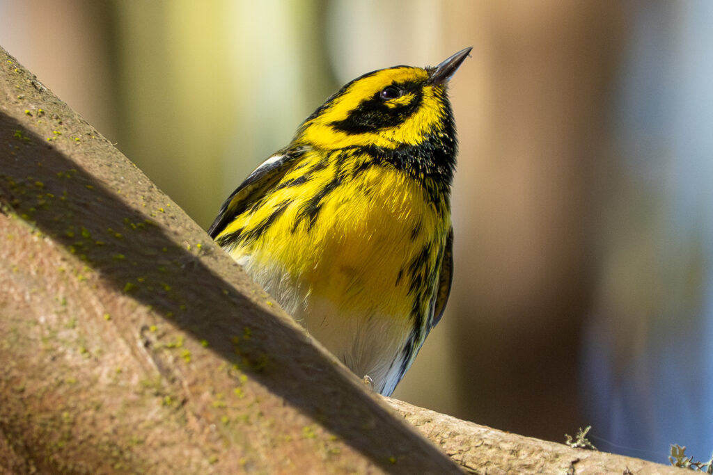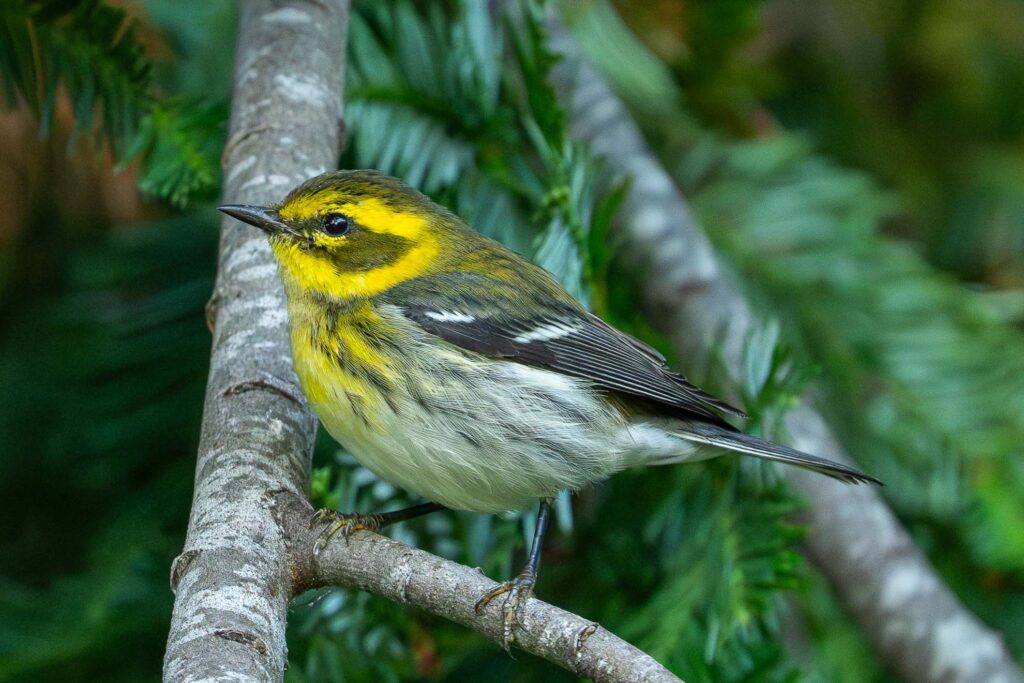 This small yellow bird of the Western states is a winter resident here on the Central Coast. It breeds to our north, in fir and spruce-fir forests. As with many warblers, adults can be sexed by their different plumages: the males have black markings on a yellow body, where the females have green to olive markings on a yellow body.