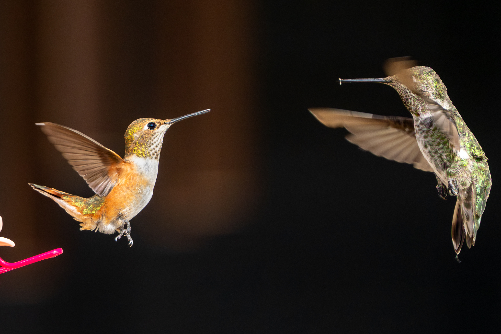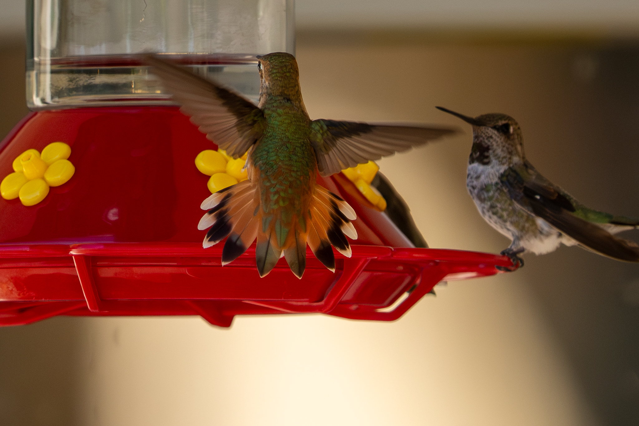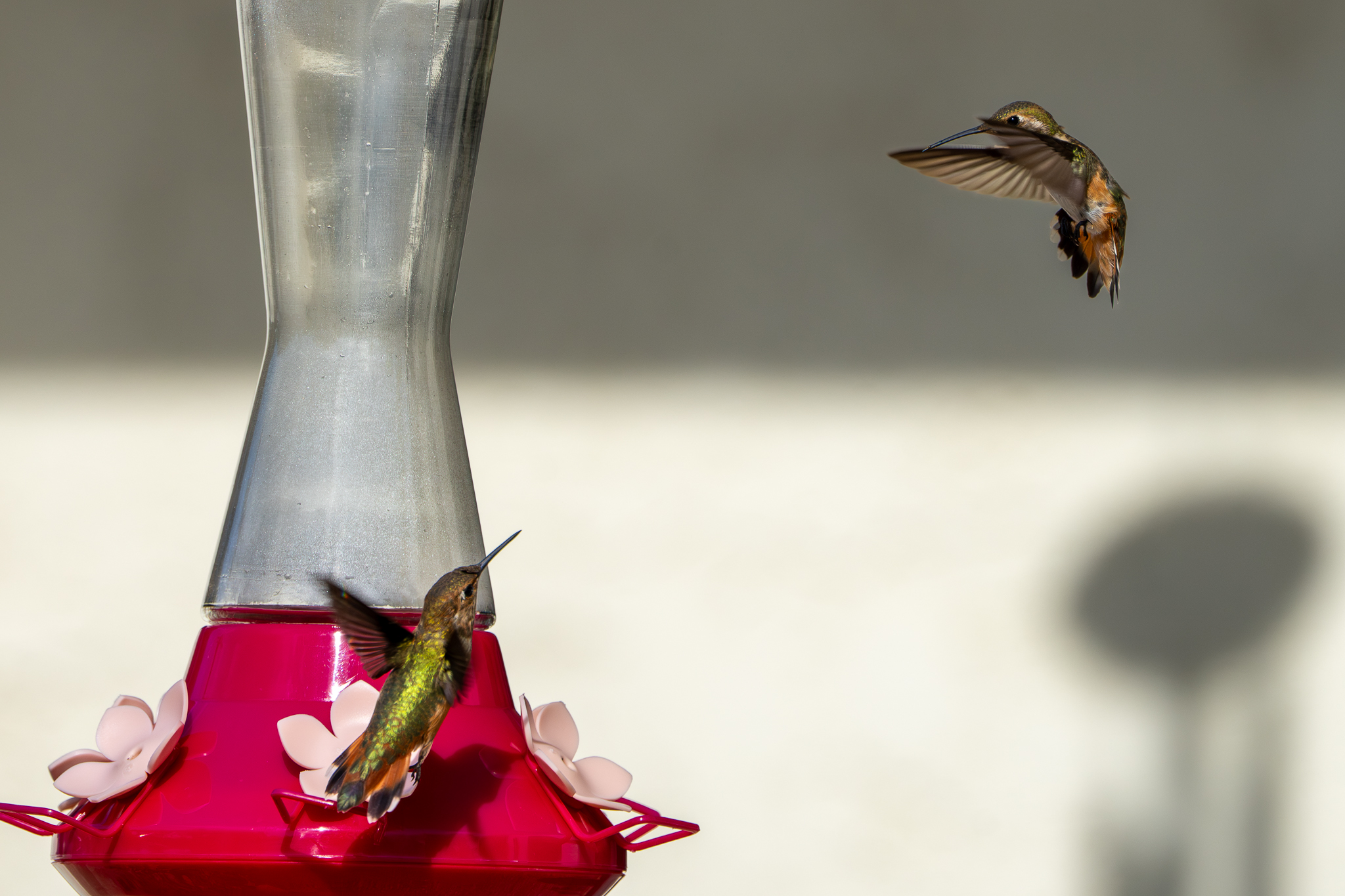 1y male Rufous Hummingbird defending the feeder against a young Anna’s Hummingbird, Atascadero, CA, August 31, 2025