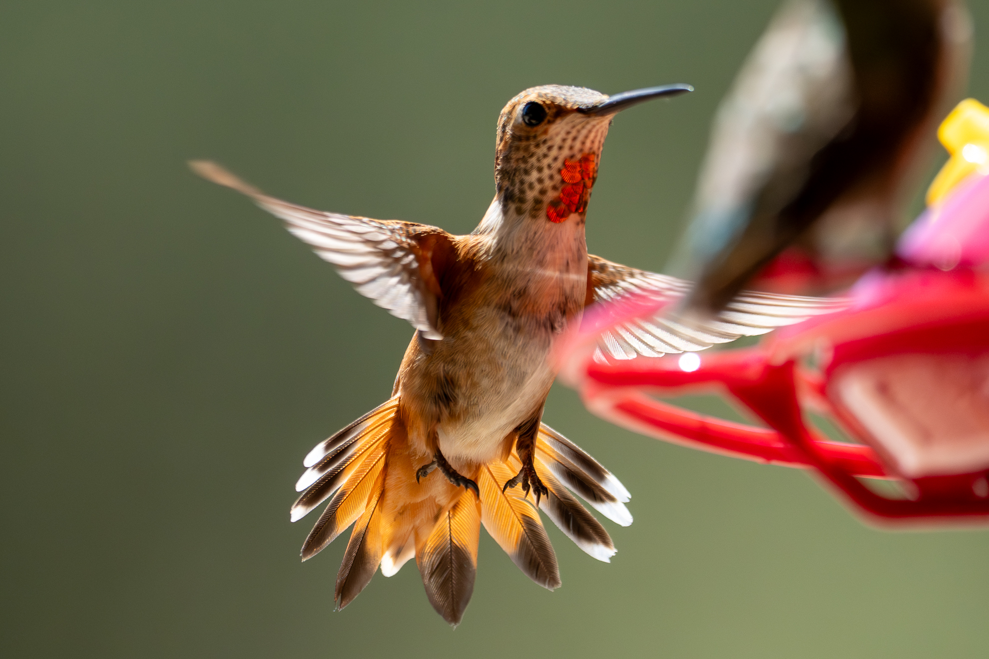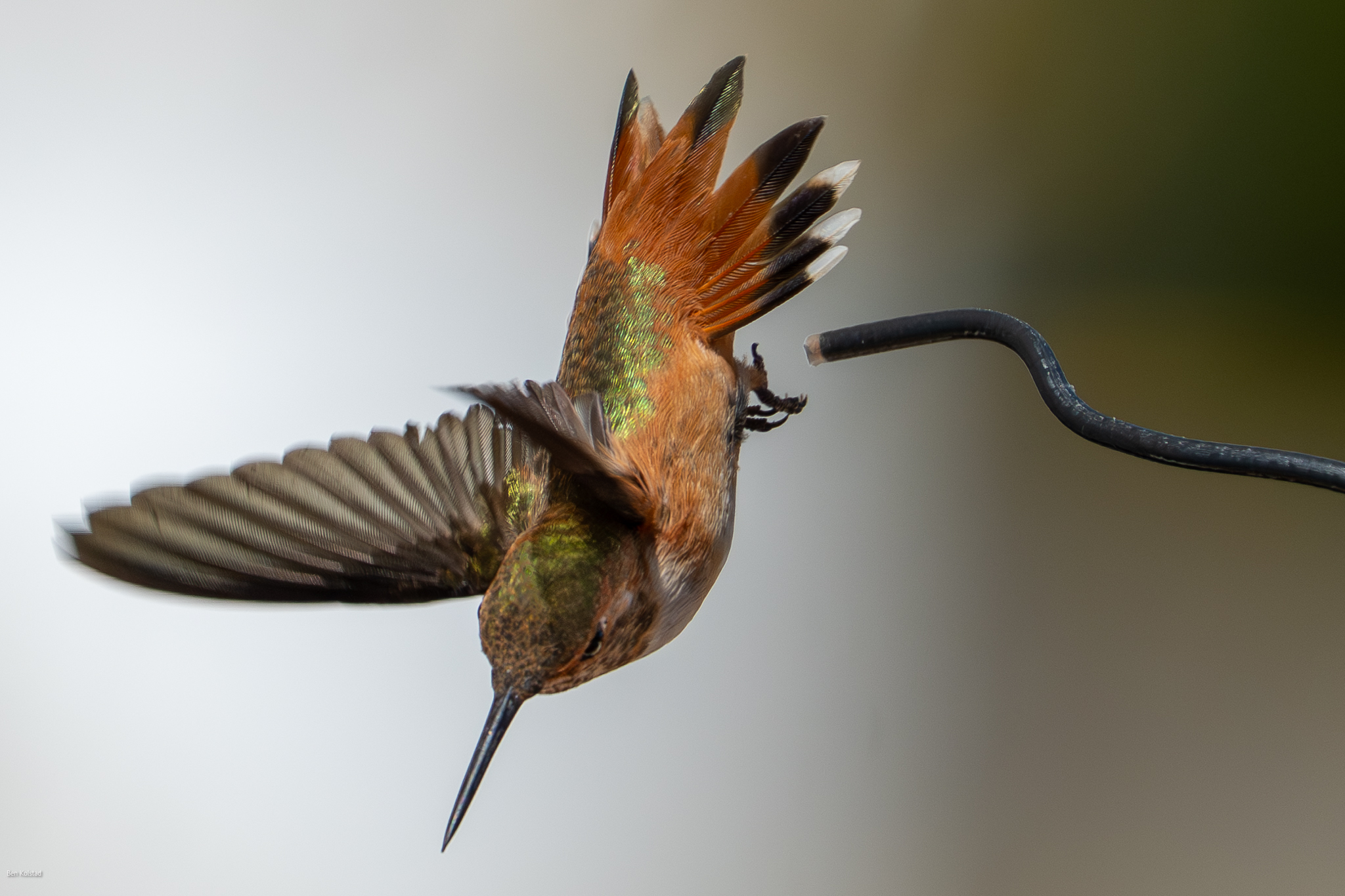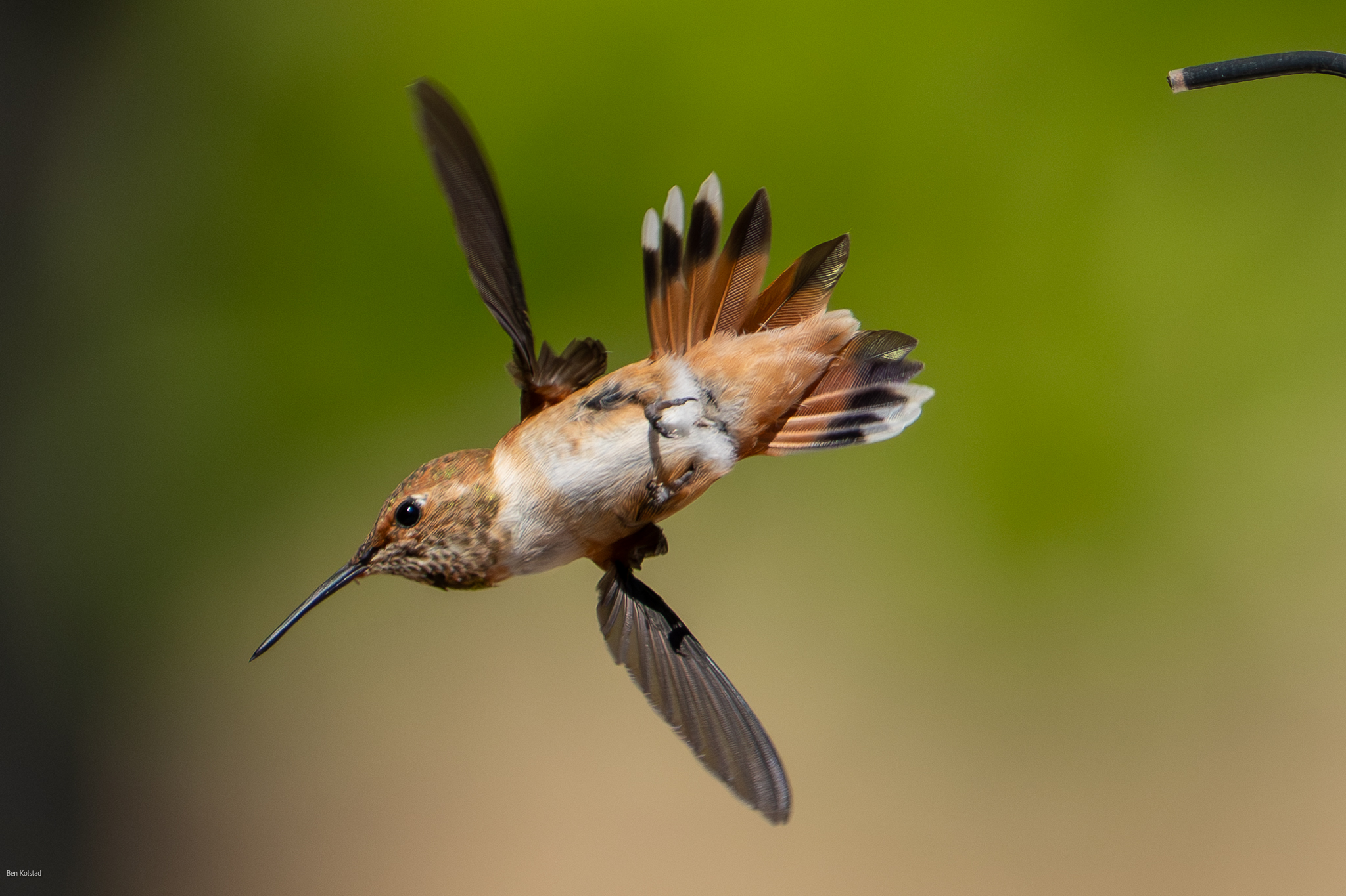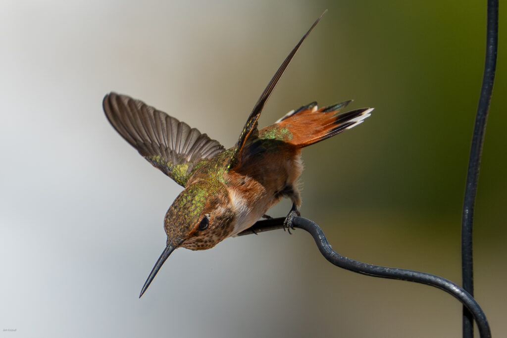 1y female Rufous Hummingbird (note white at tips of R2 and green between the black and the rufous), Atascadero, CA, August 29, 2025