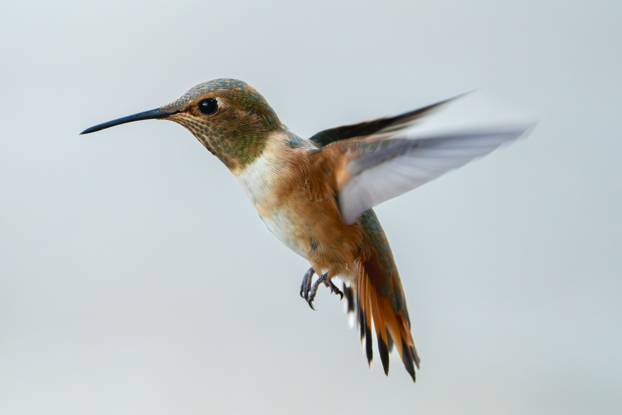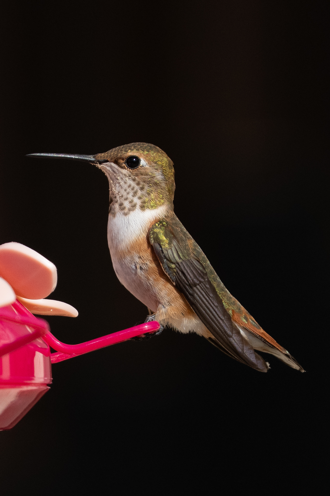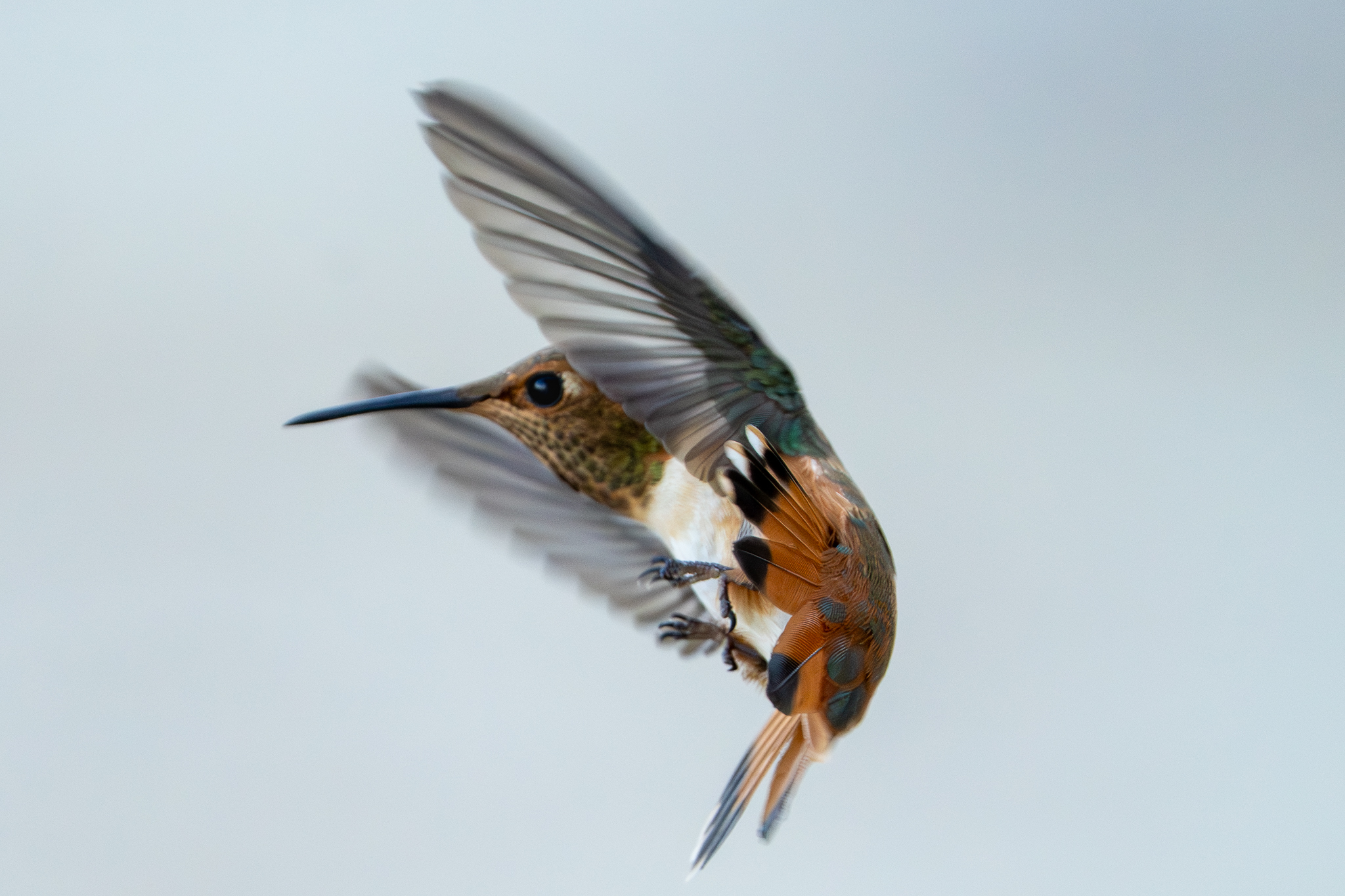 1y female Rufous Hummingbird (note white at tips of R2 and green between the black and the rufous), Atascadero, CA, August 29, 2025
